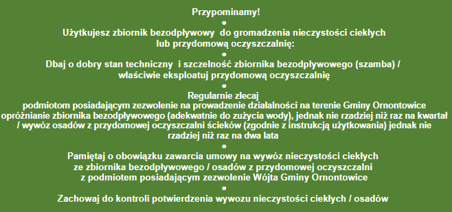 Działania kontrolne i informacyjne w zakresie przyłączenia się do sieci kanalizacyjnej prowadzone będą zgodnie z ZARZĄDZENIEM NR 0050.0224.2025 WÓJTA GMINY ORNONTOWICE z dnia 2 grudnia 2025 r. w sprawie przyjęcia zasad realizacji planu kontroli w zakresie wypełniania obowiązków określonych w art. 6 ust. 1 Ustawy o utrzymaniu czystości i porządku w gminach oraz działań w zakresie egzekwowania obowiązków określonych w art. 5 ust. 1 pkt 2) ww. Ustawy w latach 2025-2026.